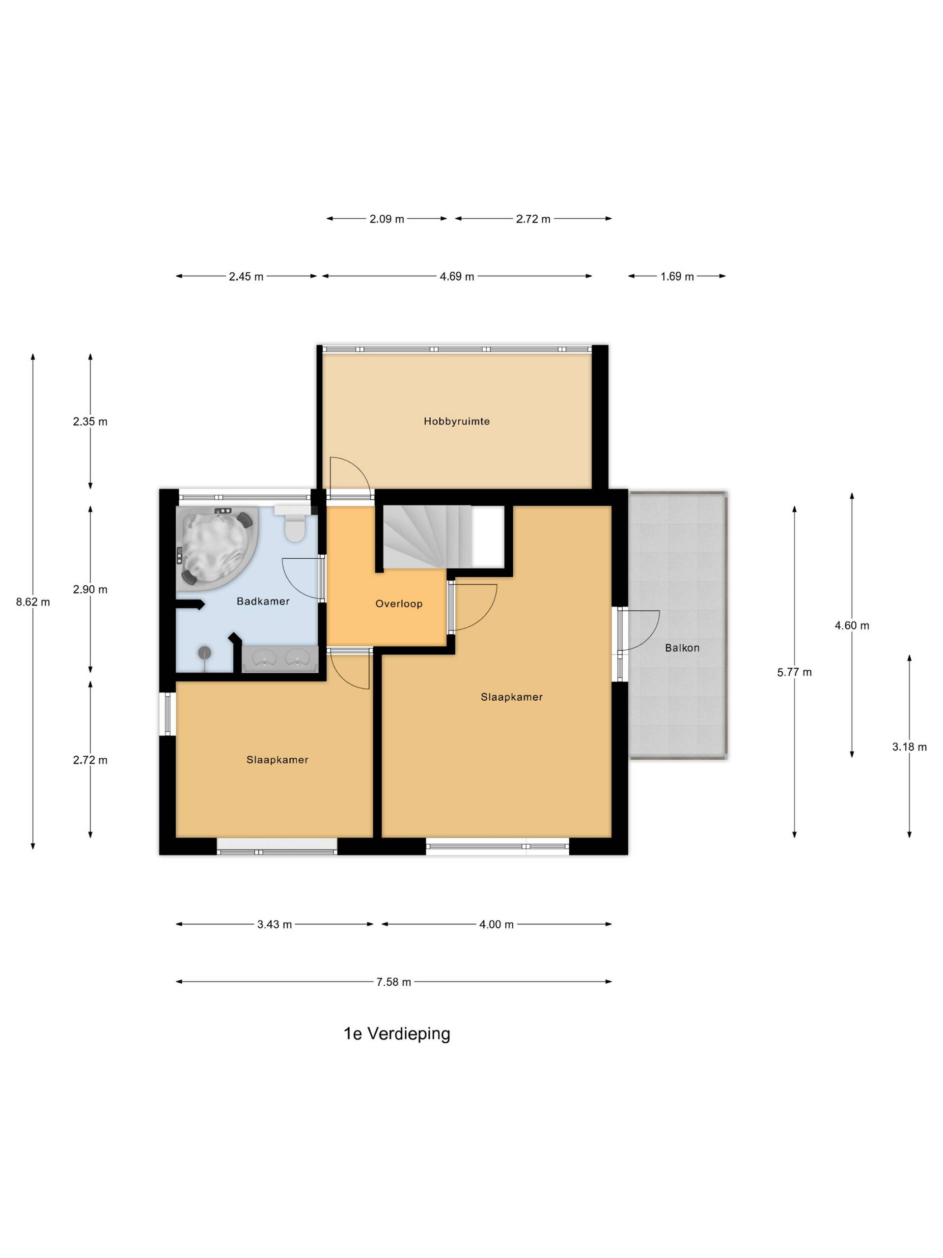 Op de eerste verdieping bevinden zich drie slaapkamers en de badkamer. De verdieping is prettig ingedeeld en voelt licht en ruim aan, mede door de goede verdeling van de kamers en de fijne lichtinval.