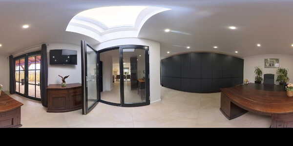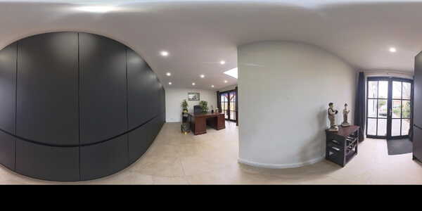 Dankzij de lichtkoepel en diverse glazen deuren valt er veel daglicht binnen, wat deze ruimte bijzonder aangenaam maakt om in te werken. Over vrijwel de volledige breedte van de ruimte is een kastenwand gerealiseerd waardoor er veel praktische bergruimte aanwezig is zonder dat dit ten koste gaat van de openheid.