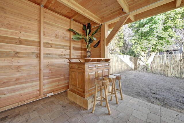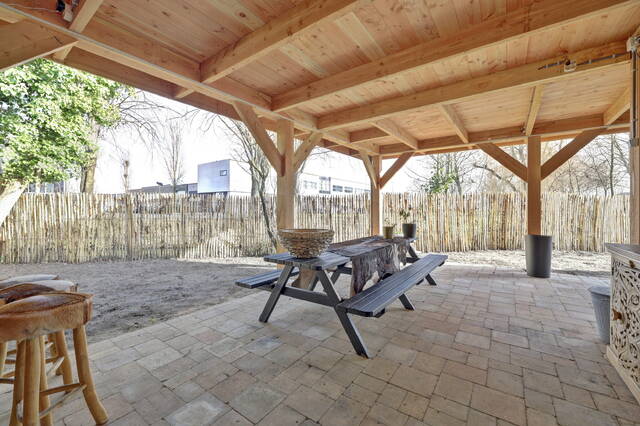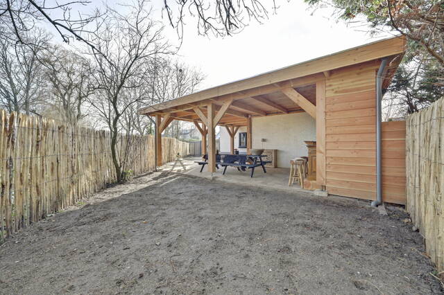 Onder de overkapping is volop ruimte om verschillende zithoeken te creëren. Momenteel is hier plaats voor een grote picknicktafel en is er een houten bar gerealiseerd, wat bijdraagt aan een gezellige en ontspannen sfeer. De gehele overkapping is netjes betegeld, waardoor deze ruimte onderhoudsvriendelijk en direct te gebruiken is. Tevens is de overkapping ook volledig gefundeerd op betonpalen.