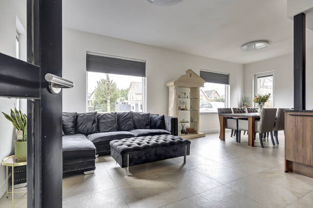 Vanuit de hal loopt u door naar de woonkamer met open keuken, een lichte en uitnodigende leefruimte waar wonen en koken op een natuurlijke manier samenkomen. De grote raampartijen zorgen voor een fijne lichtinval gedurende de hele dag en versterken het open karakter van deze verdieping. De begane grond is volledig afgewerkt met lichte, naturel crèmekleurige vloertegels en voorzien van nieuwe vloerverwarming, wat zorgt voor een comfortabel en aangenaam woonklimaat. Sunscreens en zwarte accenten, zoals de binnendeuren, geven het geheel een moderne en stijlvolle uitstraling.