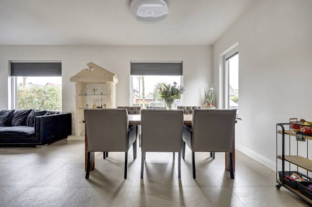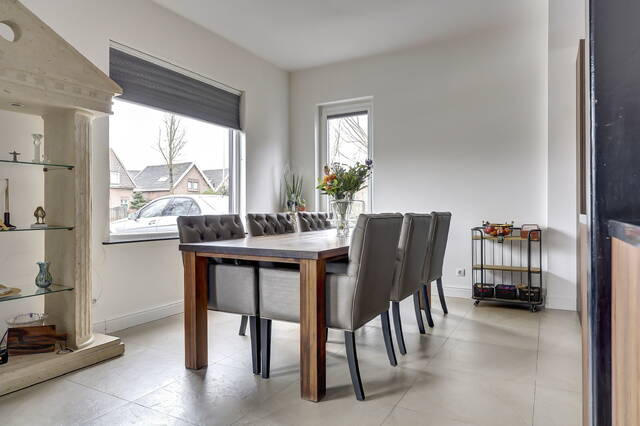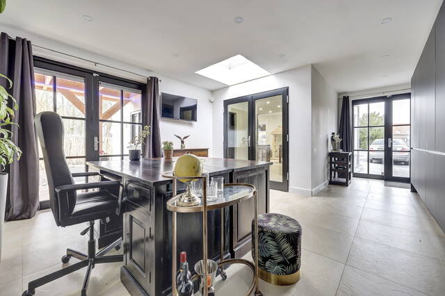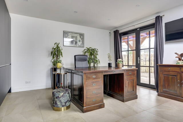 Vanuit de keuken geven openslaande deuren toegang tot de kantoorruimte, waardoor deze ruimte op een prettige en natuurlijke manier is verbonden met het woongedeelte. Het kantoor is afgewerkt met dezelfde lichte vloertegels en voorzien van vloerverwarming, wat zorgt voor comfort en een rustige uitstraling.