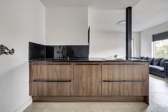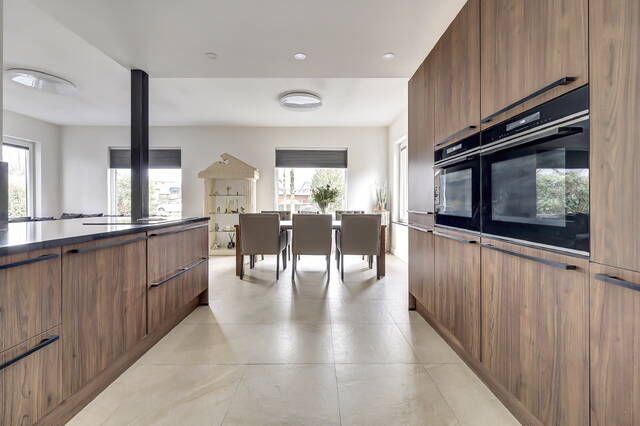 De open keuken, vernieuwd in 2023, is aan de wand gesitueerd en loopt deels door in de woonkamer, waardoor er een open en ruimtelijk geheel ontstaat. Het kookgedeelte is voorzien van een inductiekookplaat met vier zones en een geïntegreerd afzuigsysteem. Daarnaast beschikt de keuken over een vaatwasser, koelkast en dubbele combimagnetron. De keuken is uitgevoerd in een natuurlijke donkerbruine kleurstelling met zwarte accenten en een antracietkleurige natuurstenen werkblad. Dankzij de vele kasten is er meer dan voldoende bergruimte voor servies, kookgerei en voorraad.