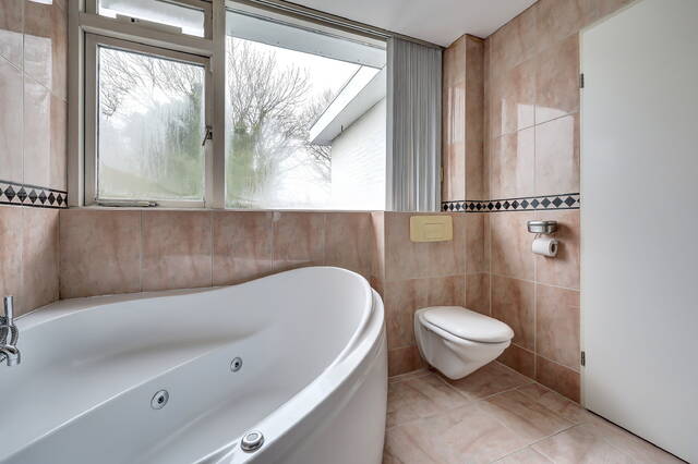 De badkamer is volledig betegeld en ruim van opzet, waardoor er een comfortabele en ontspannen sfeer ontstaat. De ruimte is praktisch ingedeeld en voorzien van een dubbele wastafel, wat prettig is voor dagelijks gebruik. Daarnaast beschikt de badkamer over een bubbelbad, een fijne plek om tot rust te komen na een lange dag. Ook is er een toilet aanwezig. Dankzij de mechanische ventilatie blijft de ruimte goed geventileerd en aangenaam in gebruik.
