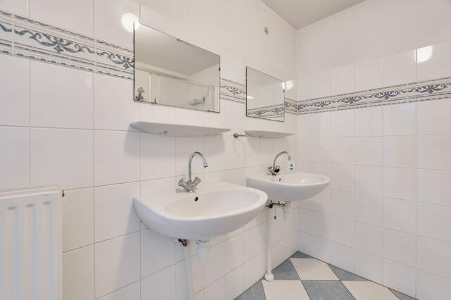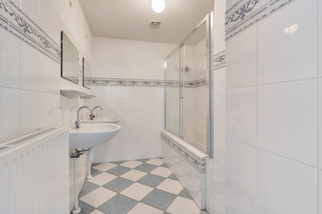 De badkamer is volledig betegeld en ingericht met een ligbad, aparte douche, dubbele wastafel en radiator. Functioneel, netjes en compleet.