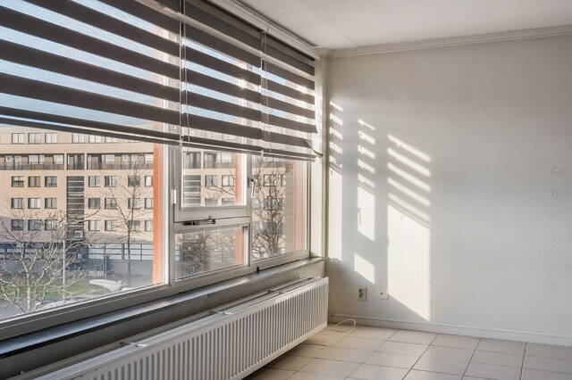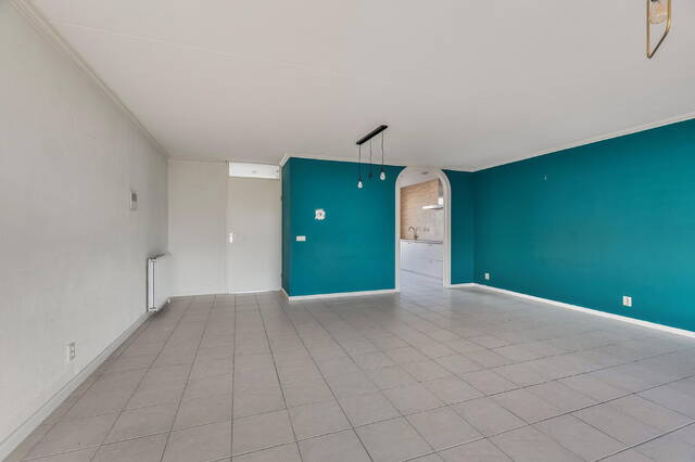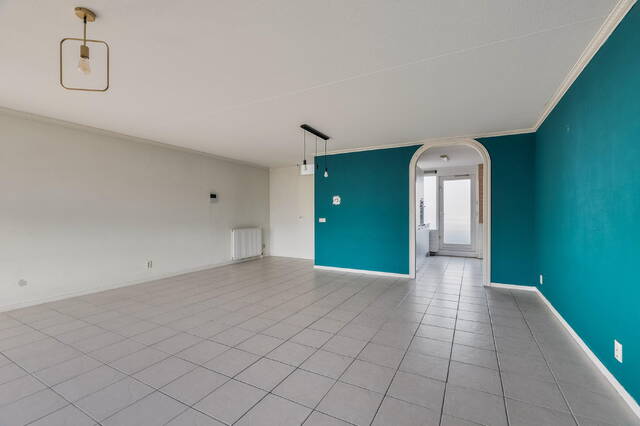 Dit is het hart van de woning. De woonkamer van 37 m2 is ruim opgezet en heeft lekker veel lichtinval door de grote raampartijen. Er ligt een nette en onderhoudsvriendelijke plavuizenvloer.
