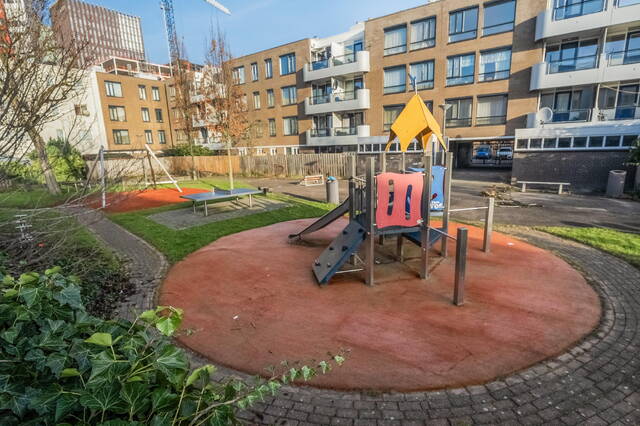 Vanuit de keuken stap je zo het dakterras van ca. 12 m² op. Het dakterras ligt aan de achterzijde van de woning op het Noordoosten. Een fijne plek om buiten te zitten, met uitzicht over een groen binnenterrein met speelvoorzieningen. Rustig, groen en verrassend aangenaam.