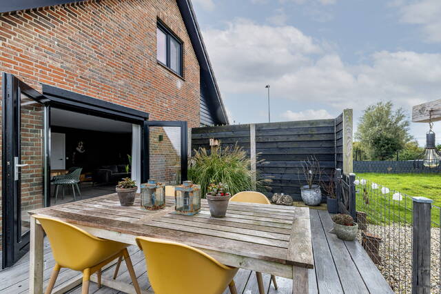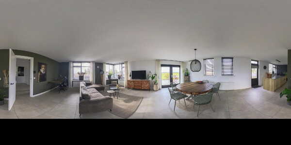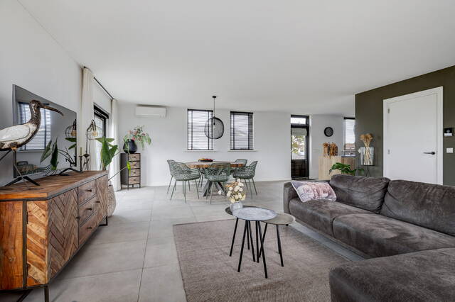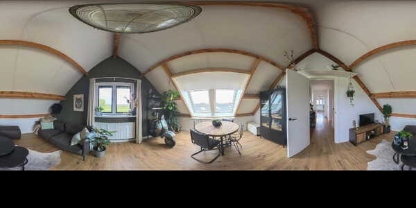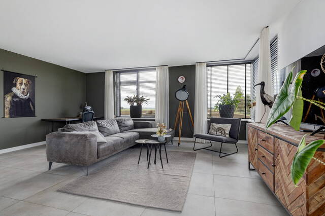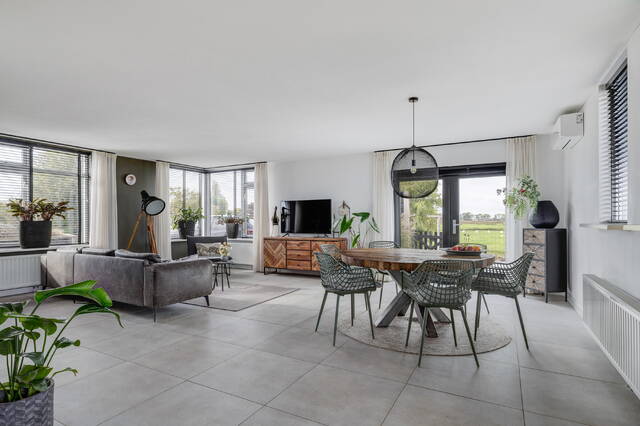 De woonkamer is een heerlijke, lichte ruimte met ramen rondom en een adembenemend uitzicht over de polder. Via openslaande deuren bereikt u het terras op dijkniveau, afgewerkt met houten vlonders, dé plek om te genieten van zon, uitzicht en rust.