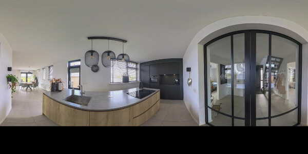 De open keuken vormt het hart van het huis en is uitgevoerd in een stijlvolle combinatie van zwart en houttinten. De wandopstelling biedt veel kastruimte, een koel-vriescombinatie, combi-oven en een nis met coffeecorner en verlichting. Het kook-/spoeleiland met composiet werkblad in betonlook is voorzien van een Bora inductiekookplaat met geïntegreerde afzuiging, vaatwasser, spoelbak en een gezellige eetbar. Vanuit de keuken is er middels een trap toegang tot het achtererf met de loods en oprit.