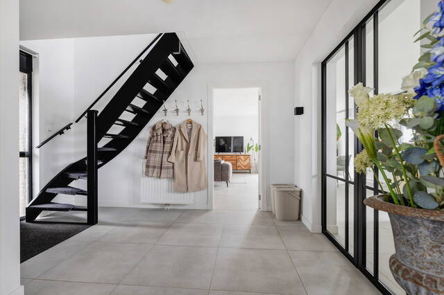 - Fraaie zwart stalen trapleuning en witte paneeldeuren in de hele woning zorgen voor een stijlvolle afwerking