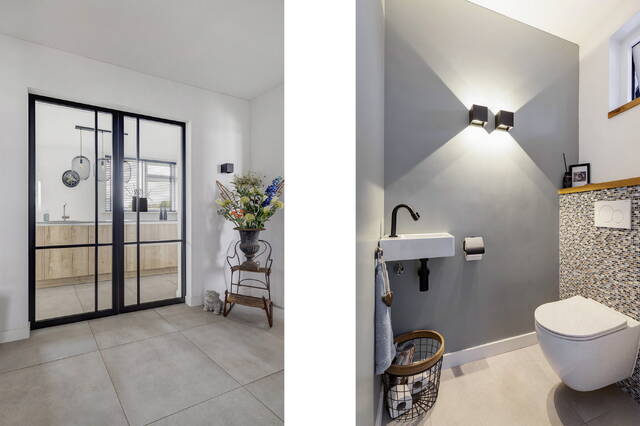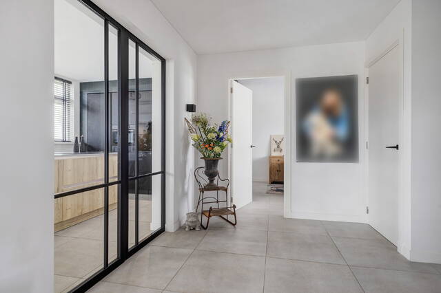 Via de ruime entreehal met de garderobe, meterkast en de toiletruimte betreedt u deze modern afgewerkte woning. De toiletruimte is strak uitgevoerd met glad stucwerk, een hangend toilet en fonteintje. Vanuit de hal heeft u toegang tot de woonkamer, slaapkamer met badkamer ensuite en de keuken, bereikbaar via prachtige zwarte glazen schuifdeuren die direct zorgen voor een stijlvolle en lichte verbinding tussen de ruimtes.