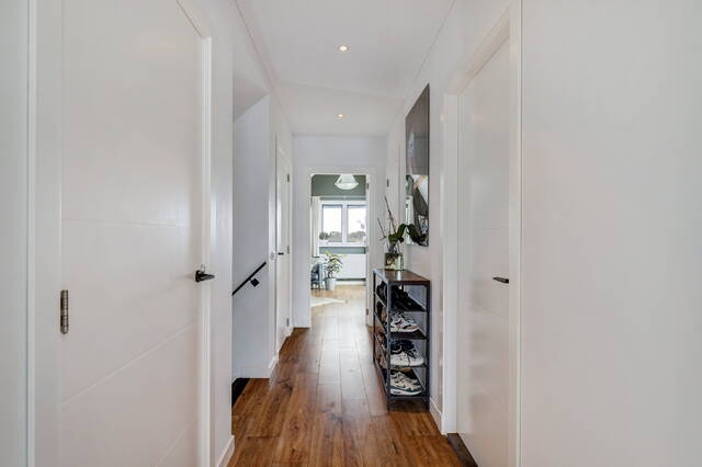 De ruime overloop biedt toegang tot twee slaapkamers, een tweede badkamer, een inloopkast, wasruimte en aparte CV-ruimte.