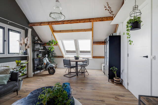 Slaapkamer 1 is voorzien van twee kunststof Velux dakramen met HR++ glas en elektrische rolluiken, houten balken, laminaatvloer en airconditioning.