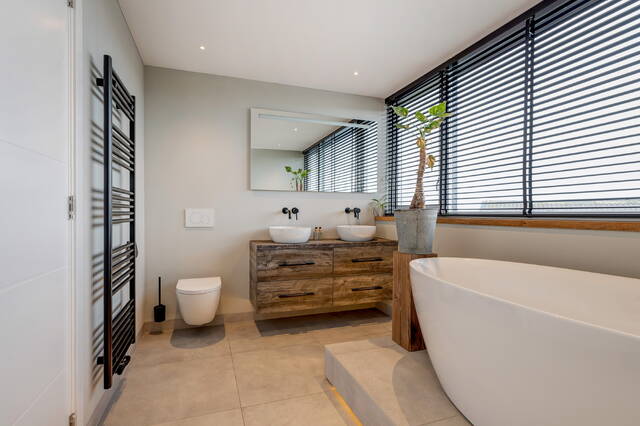 De badkamer is een waar wellnessgevoel: een riante inloopdouche met zwarte regendouche, een dubbel wastafelmeubel met houten accenten en moderne inbouwverlichting. Afgewerkt met grote grijze wand- en vloertegels, glad stucwerk en mechanische ventilatie (automatische vochtmeting).