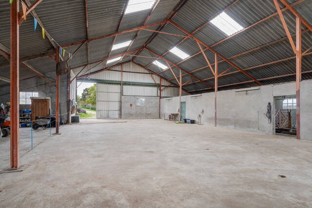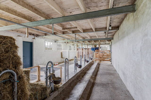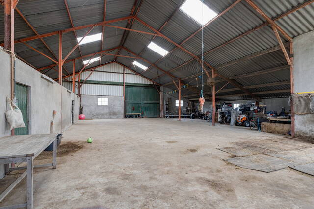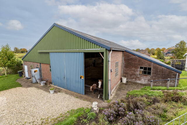 Achter de woning bevindt zich de imposante loods/schuur van ruim 380 m², thans ingericht als paardenstal. De betonnen vloer, brede toegangsdeuren en vrije hoogte maken deze ruimte geschikt voor talloze doeleinden: paardenstalling, caravan- of camperopslag, hobbyruimte of werkplaats.