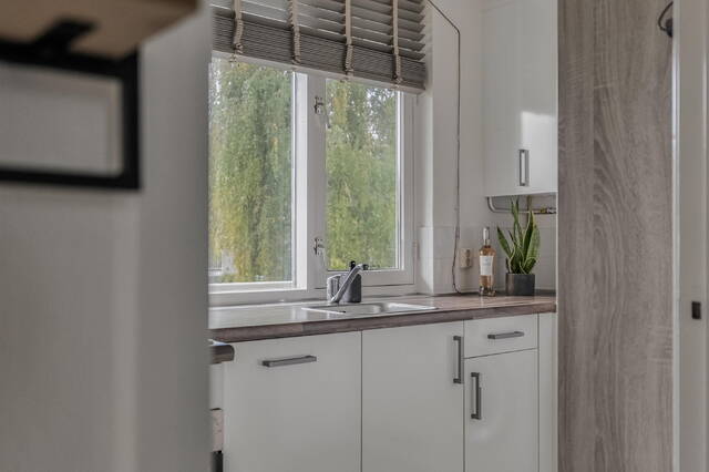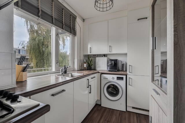 De keuken is gelegen aan de achterzijde van het complex. De keuken is verder uitgevoerd in een U-opstelling en voorzien van een koelkast, vriezer, 4-pits gaskookplaat, RVS afzuigkap, combimagnetron en een vaatwasser. Verder is de keuken voorzien van de wasmachine- en drogeraansluiting, en een enkele spoelbak. Het geheel is uitgevoerd in wit en is afgewerkt met een kunststof aanrechtblad en laminaatvloer.